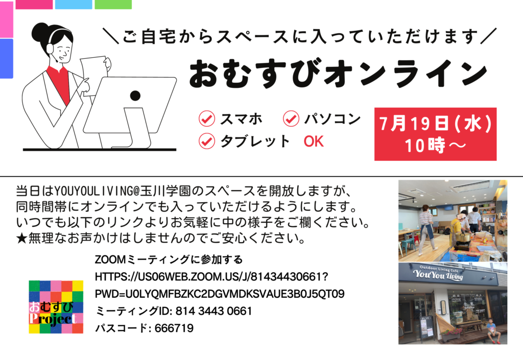 7月19日(水)10時~、玉川学園YouYouLivingでのスペース開放は、オンラインでもスペースへ接続できるようにいたします!